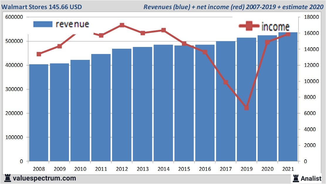 WalmartDie Analysten erwarten für 2020 einen Jahresüberschuss von 15.88 Mrd. Dollar. Für dieses Jahr ist der Konsens der Analysten für das Ergebnis pro Aktie ein Gewinn von 5.59 Dollar. In Bezug auf die Prognosen der Analysten beträgt das Kurs-Gewinn-Verhältnis 26.06.