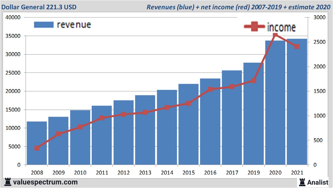 Auf Basis der Anzahl der noch ausstehenden Aktien beträgt die Marktkapitalisierung von Dollar General 55.75 Mrd. Dollar. In den letzten 12 Monaten war die Dollar General Aktie recht unbeständig. Im Vergleich zum letzten December ist der Aktienpreis um 1 Prozent höher. In diesem Jahr lag der Aktienpreis zwischen 174 und 239 Dollar.